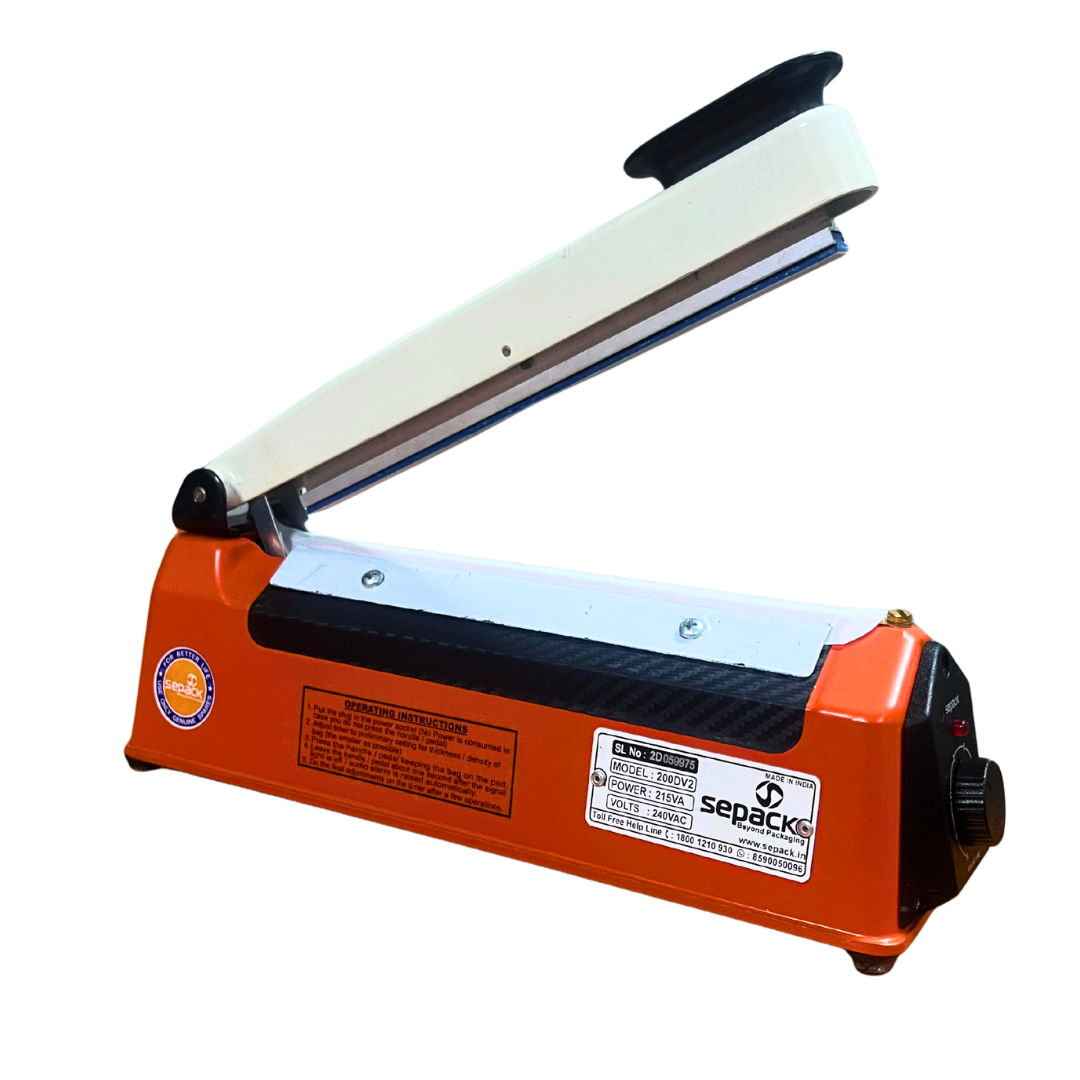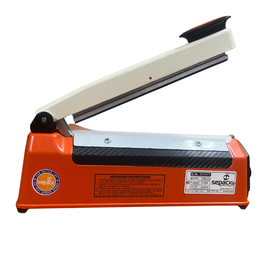 The Sepack 8 Inch Heat Sealing Machine 200 Delta V2 is designed for sealing plastic bags and laminated pouches in packaging applications. It uses impulse heating technology, where heat is generated only when the sealing arm is pressed, helping reduce power consumption.